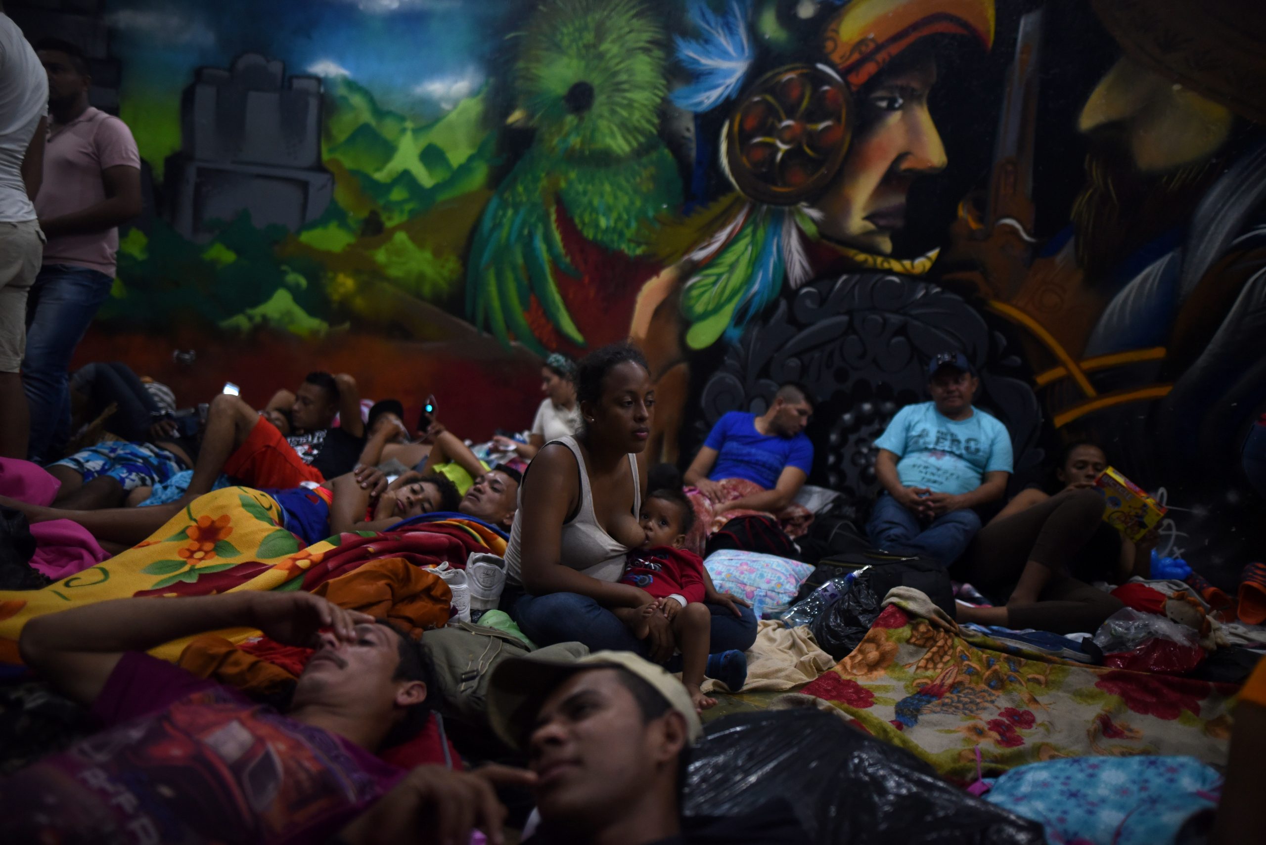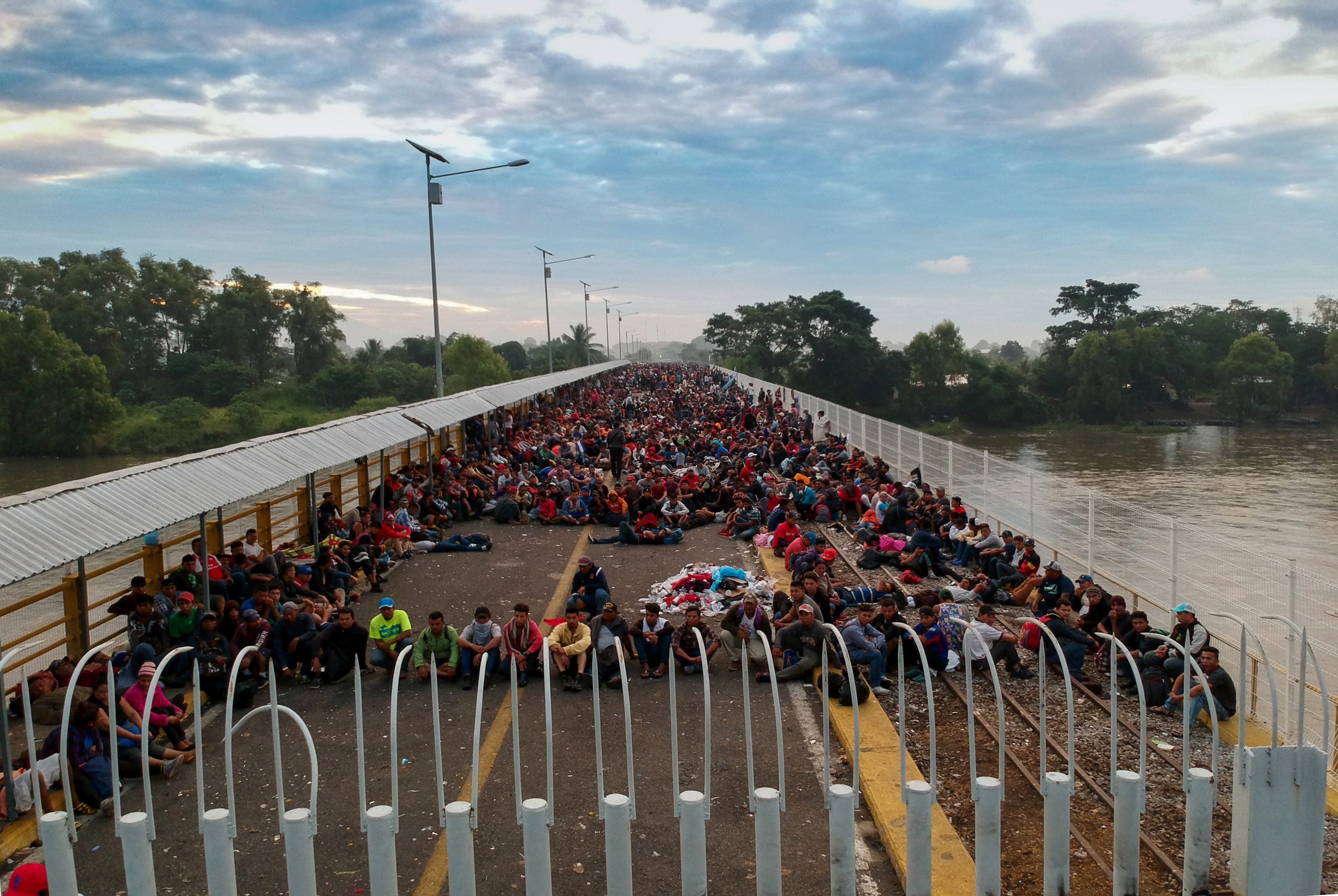 Foto 3. Al menos 4,000 centroamericanos, en su mayoría hondureños, descansan en el puente internacional Rodolfo Robles-que conecta Guatemala y México- luego de haber pasado la noche en espera de que las autoridades mexicanas les permitieran ingresar a México para continuar su viaje hacia los Estados Unidos. 19 de octubre de 2018.