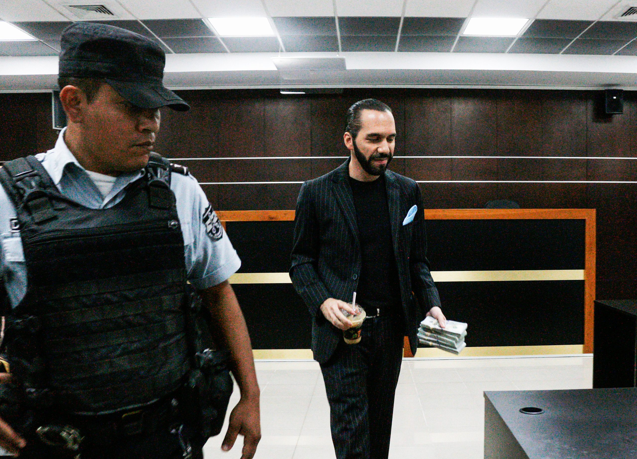 Foto 1. El Presidente electo de El Salvador, Nayib Bukele (2019-2024), llega a los juzgados para conciliar un acuerdo de $50,000 (que llevó en efectivo) en el juicio por calumnias con el exsecretario de Comunicaciones de la Presidencia de El Salvador Eugenio Chicas en San Salvador, El Salvador, el 7 de marzo de 2019.