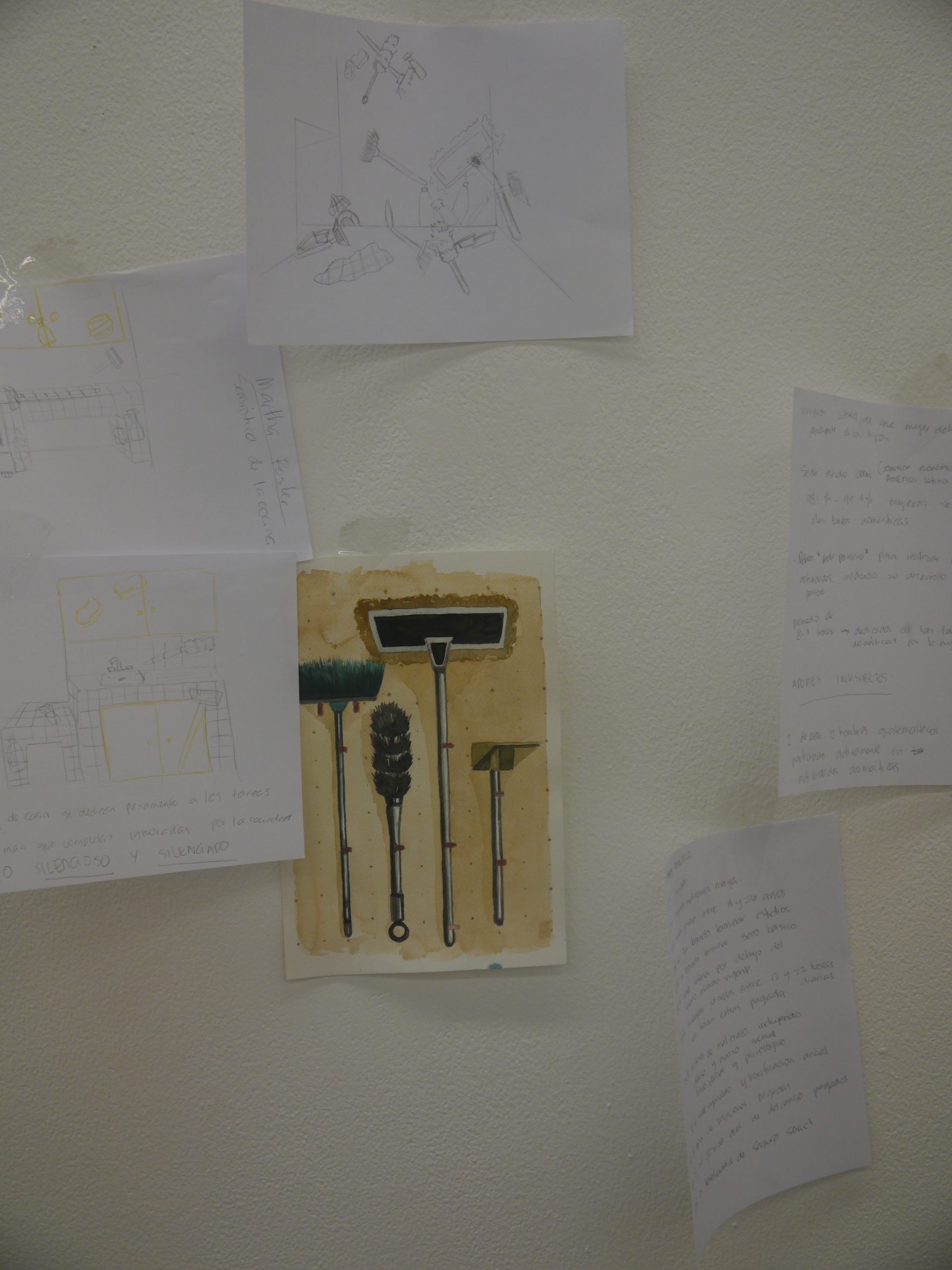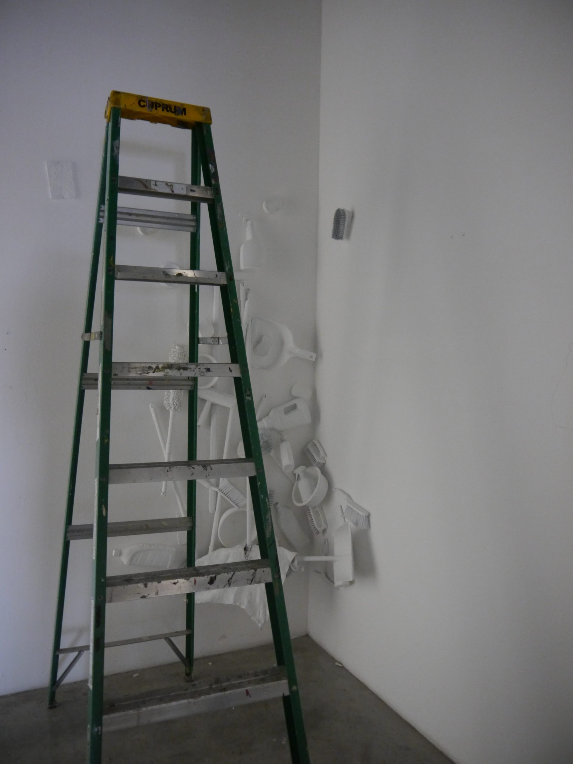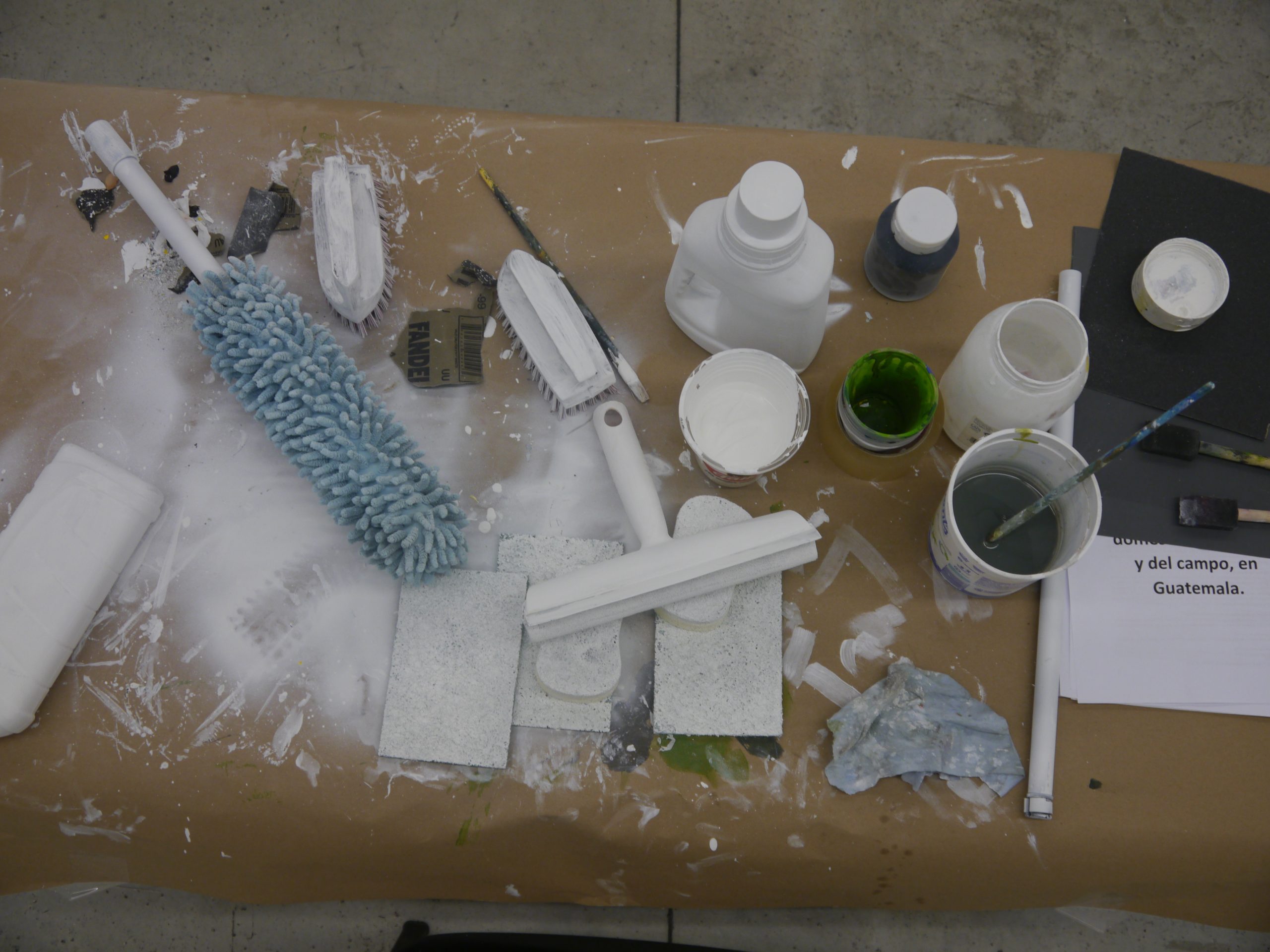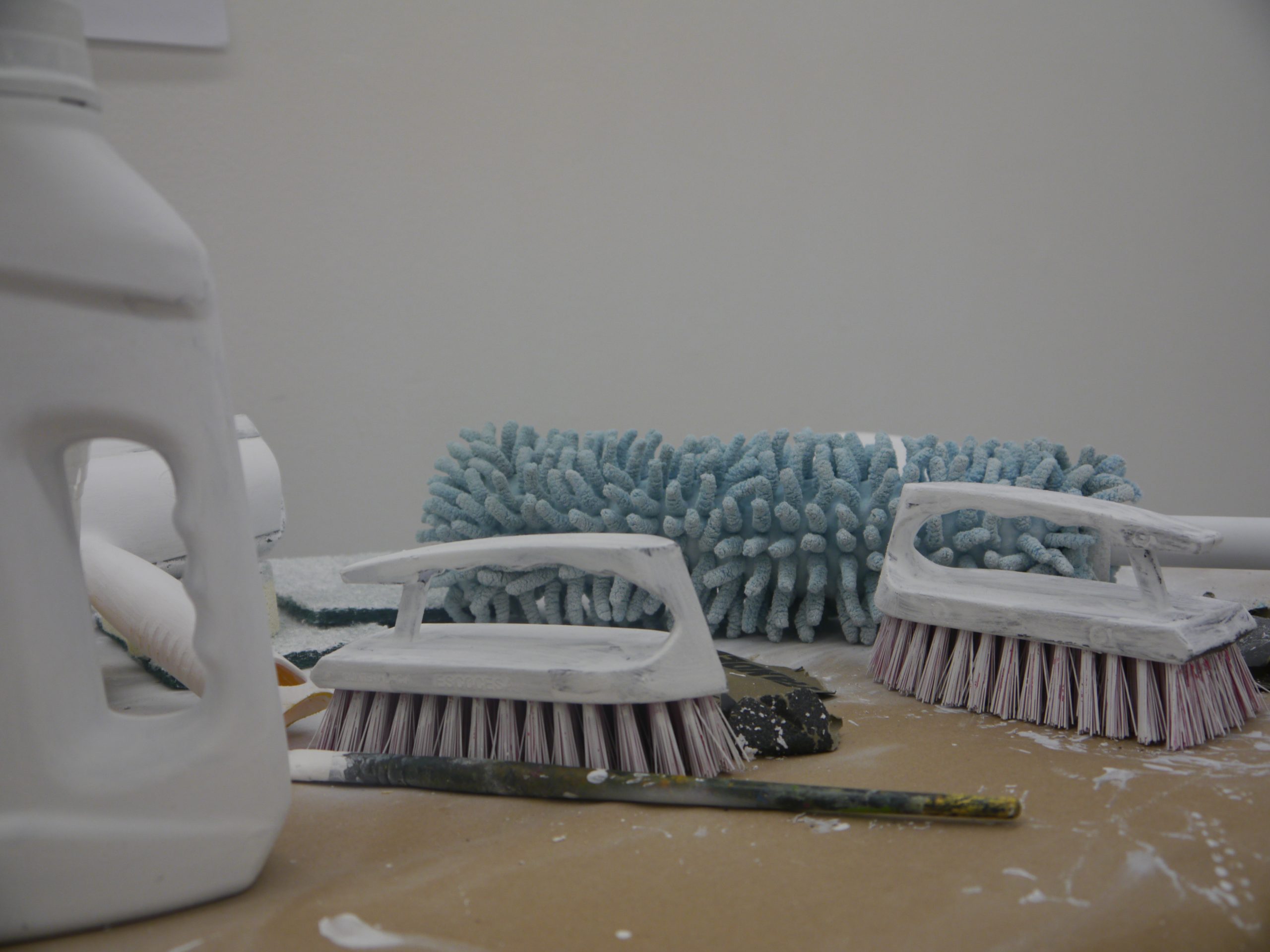 La obra será representada exhibiendo esculturas de resina y pintura blanca y negra de instrumentos de limpieza que usualmente se usan para el trabajo doméstico y aseo del hogar: escobas, trapeadores, esponjas...