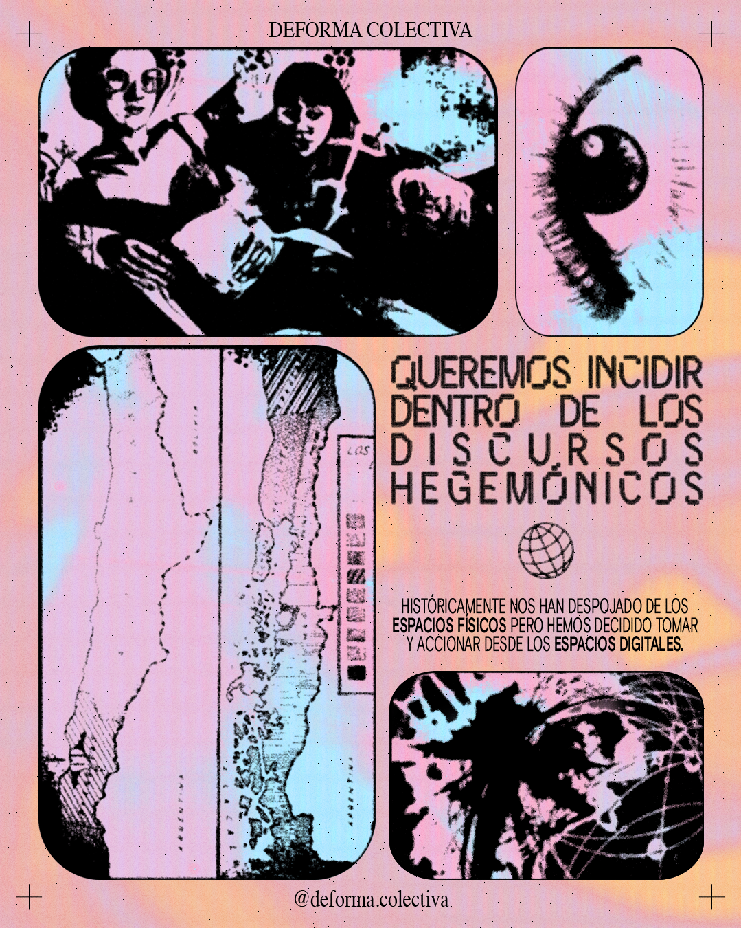 Durante esta residencia realizarán una serie de investigaciones a partir de herramientas antropológicas que pretenden colocar en el espacio digital debates políticos entre el arte, feminismo y racismo. Lo cual tendrá un formato de manifiesto que será socializado a través de posts en la cuenta de insta @deforma.colectiva, este proceso se ha nombrado “Carteles Incidentes”. Además, cada investigación tiene un proceso individual de construcción visual porque la línea gráfica no es considerada solo un formato sino parte fundamental del discurso.