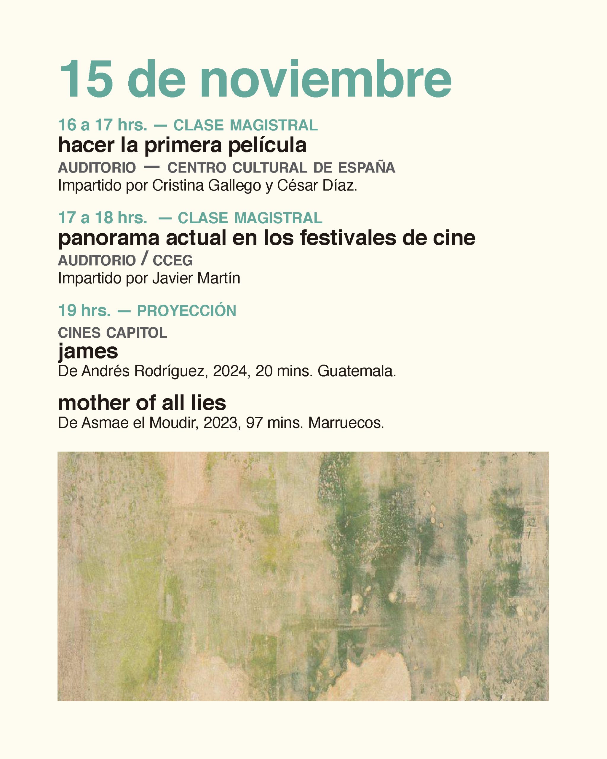 El programa de charlas y conferencias abiertas al público se desarrollará en la sede del Centro Cultural de España en Guatemala, e incluye clases magistrales y mesas redondas sobre temas como la Ley de cine, la libertad de expresión o los circuitos de exhibición. La programación se completa con un ciclo de proyecciones en los Cines Capitol con cortometrajes y largometrajes del cine contemporáneo mundial.