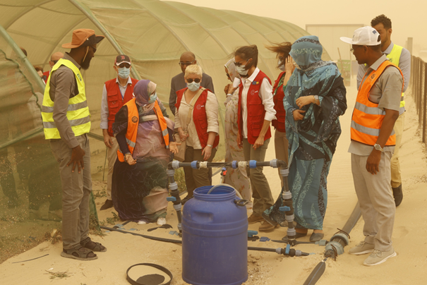 Una vez instalado el riego por goteo, se plantaron árboles frutales y plantas forrajeras que a su vez hacen de corta vientos, tan necesarios en este tórrido clima desértico de fuertes vientos y altas temperaturas. Los 130 beneficiarios, seleccionados de un listado de solicitudes de más de 1400 candidatos, empezaron a cultivar sus verduras, cada uno en su parcela. Pocos imaginarían ver tanto verde en un lugar así, en medio del Sáhara, y menos en junio, cuando las temperaturas son más altas y la actividad agrícola se vuelve más difícil. Así lo pudo atestiguar la misma Reina Letizia de España, en su visita del año 2022, que coincidió además con una tormenta de arena -quizá la tormenta más mediatizada de la historia.