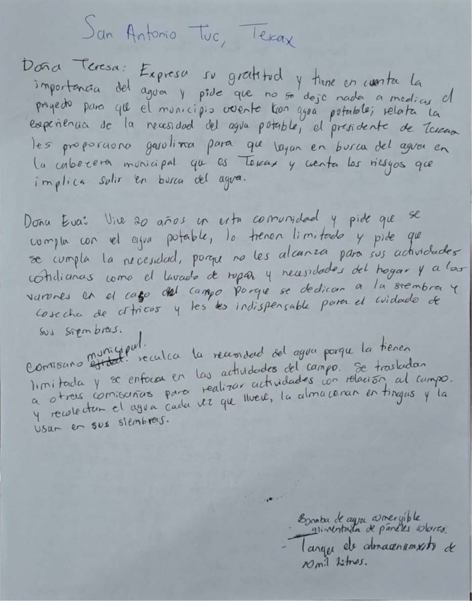 De acuerdo con los principios de los principios de la Consulta Previa, el proceso se está desarrollando de acuerdo a la cultura y las propias formas de expresión de la comunidad, de tal manera que se asegure tanto la comprensión de los participantes de todos los puntos del proceso, y se recoja de la manera más fehaciente la expresión directa y sincera de las personas indígenas, se han recogido testimonios de puño y letra de los participantes, en los que se contienen las aportaciones de sus vecinos, con testimonios como el de Doña Teresa, que “expresa su gratitud… y pide que no se deje nada a medias”.